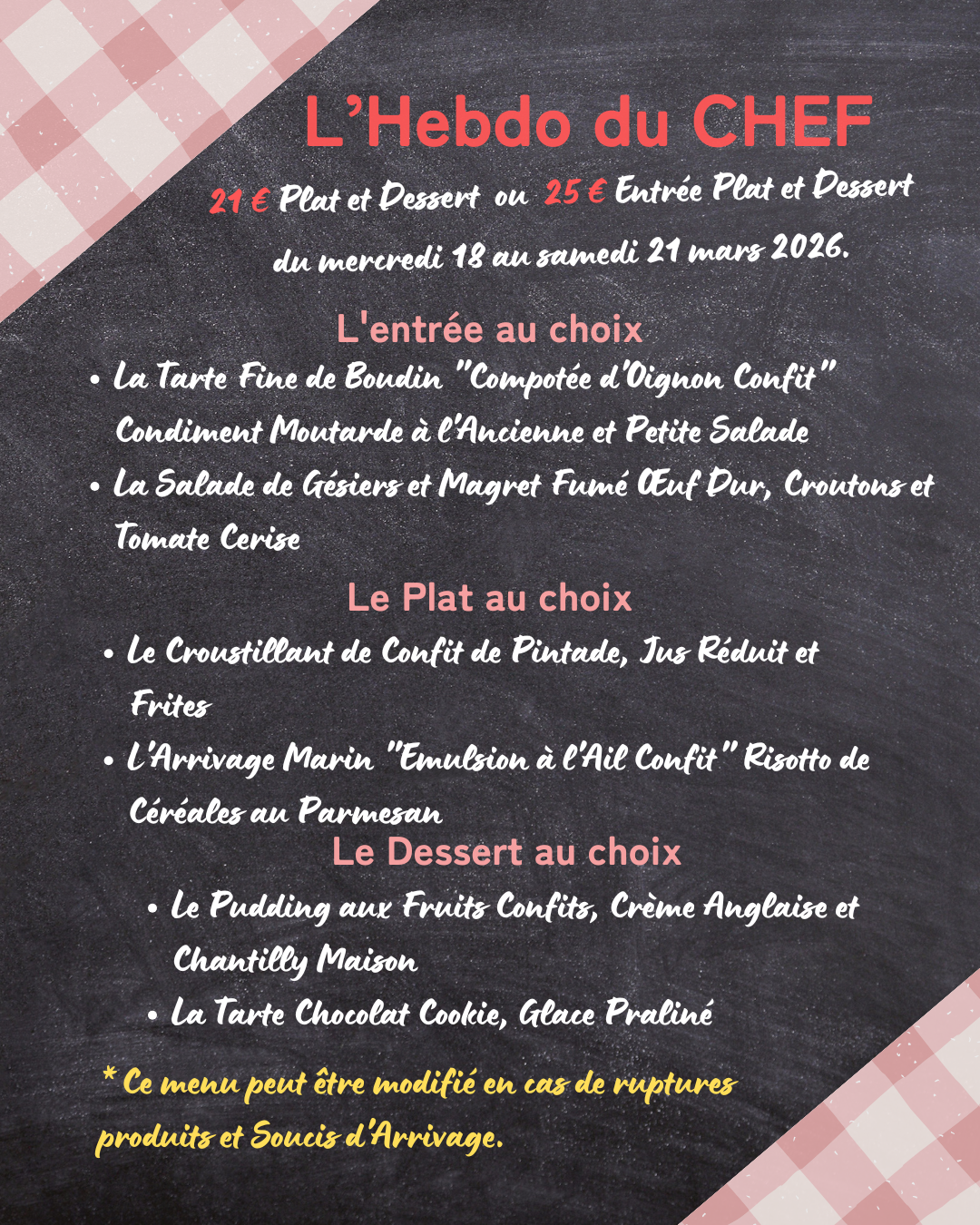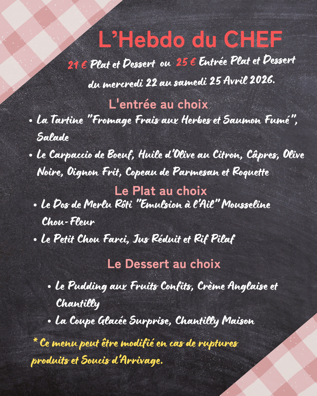 --- Au Bistrot L'Hebdo du CHEF à 25 € (Entrée, Plat et dessert) Proposé au déjeuner du mercredi au dimanche (menu spécial) ---
