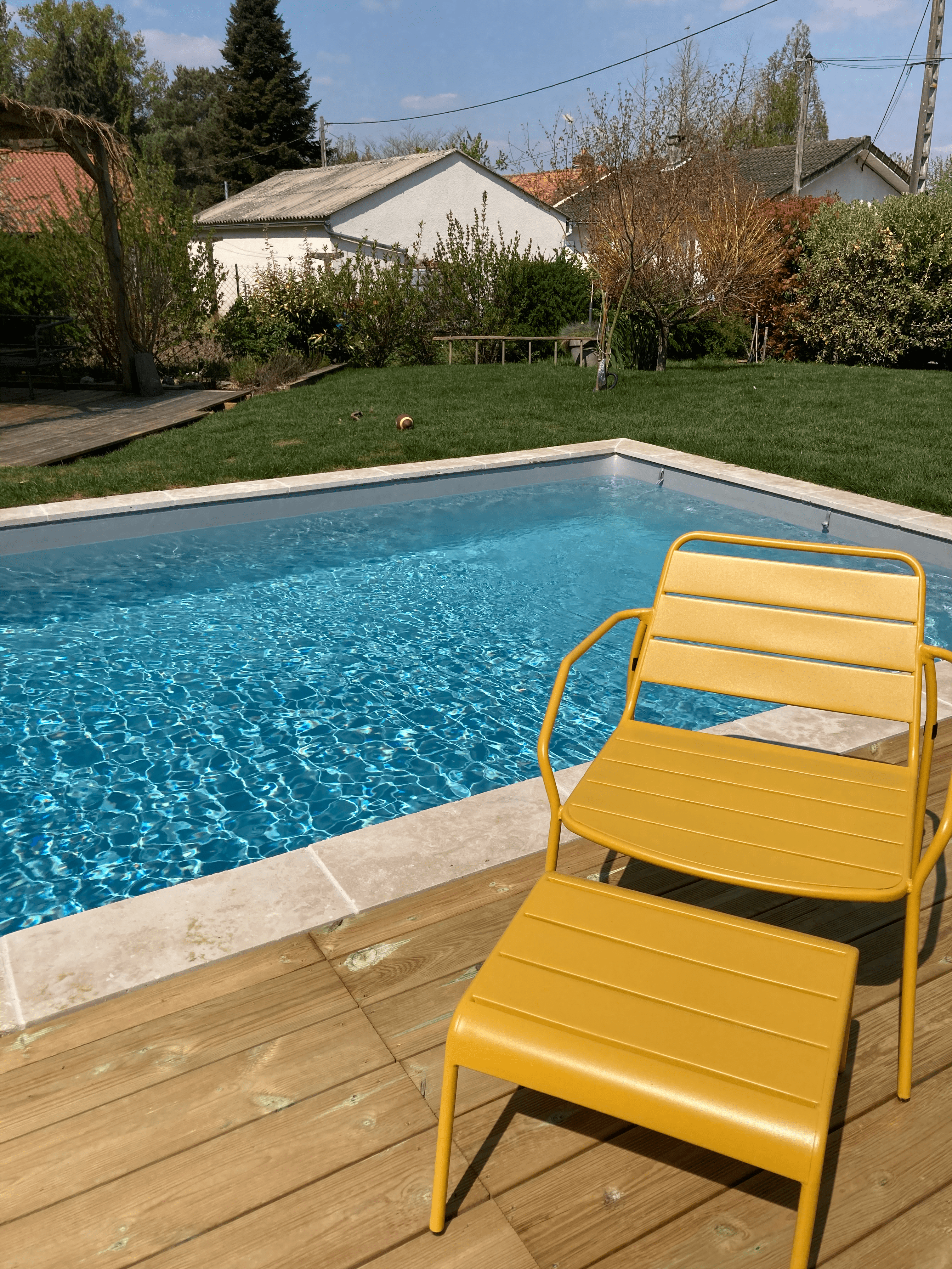 une large baie lui offre une ouverture sur une terrasse et un petit jardin en pelouse avec une piscine chauffée (ouverte de mai à septembre).